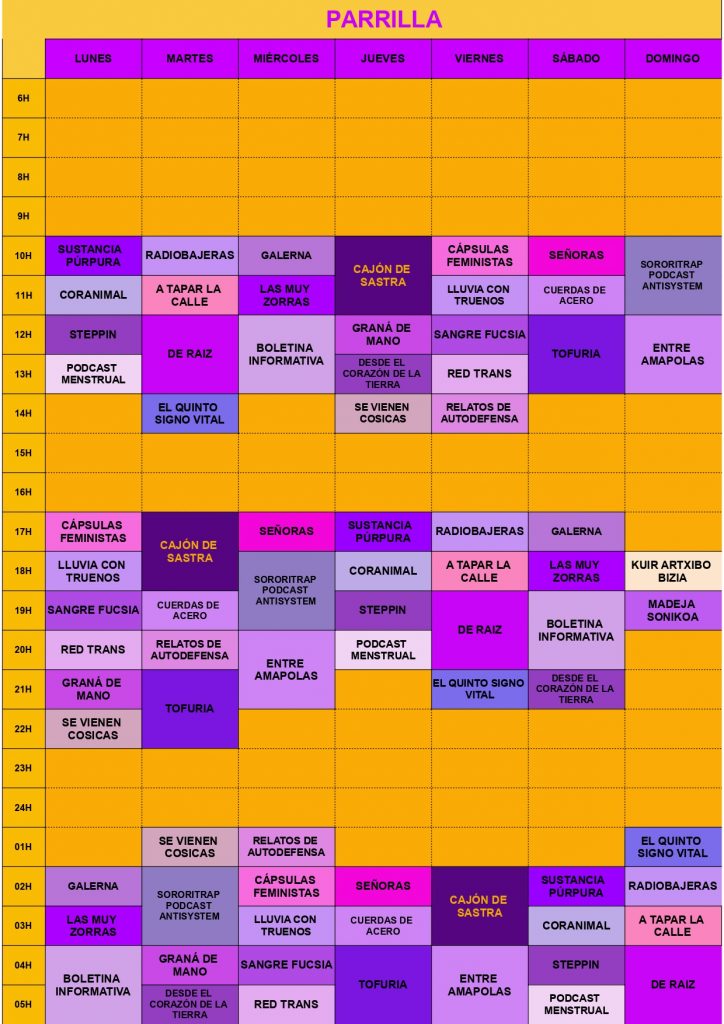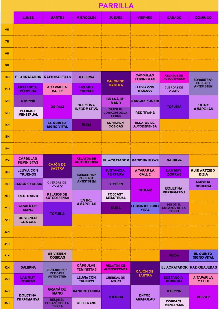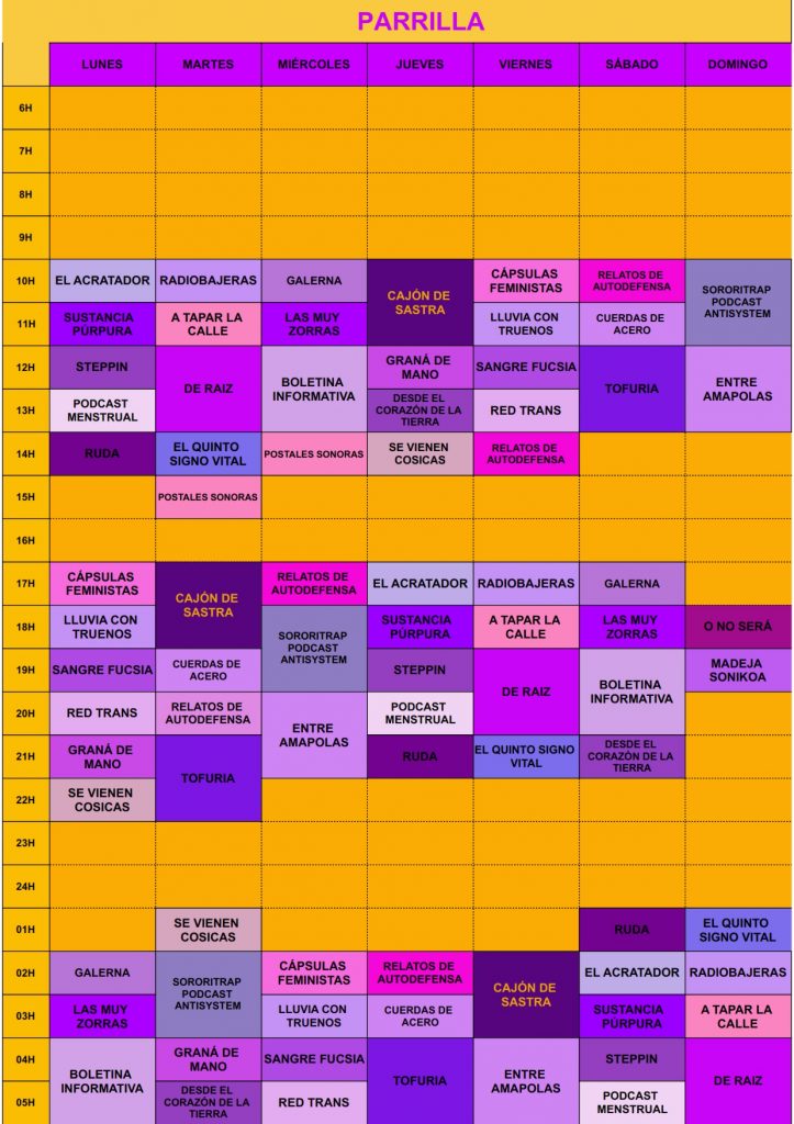 Aquí podéis consultar la parrilla 24/7 de Ruido Feminista radio, es decir el día y la hora de emisión de cada programa.